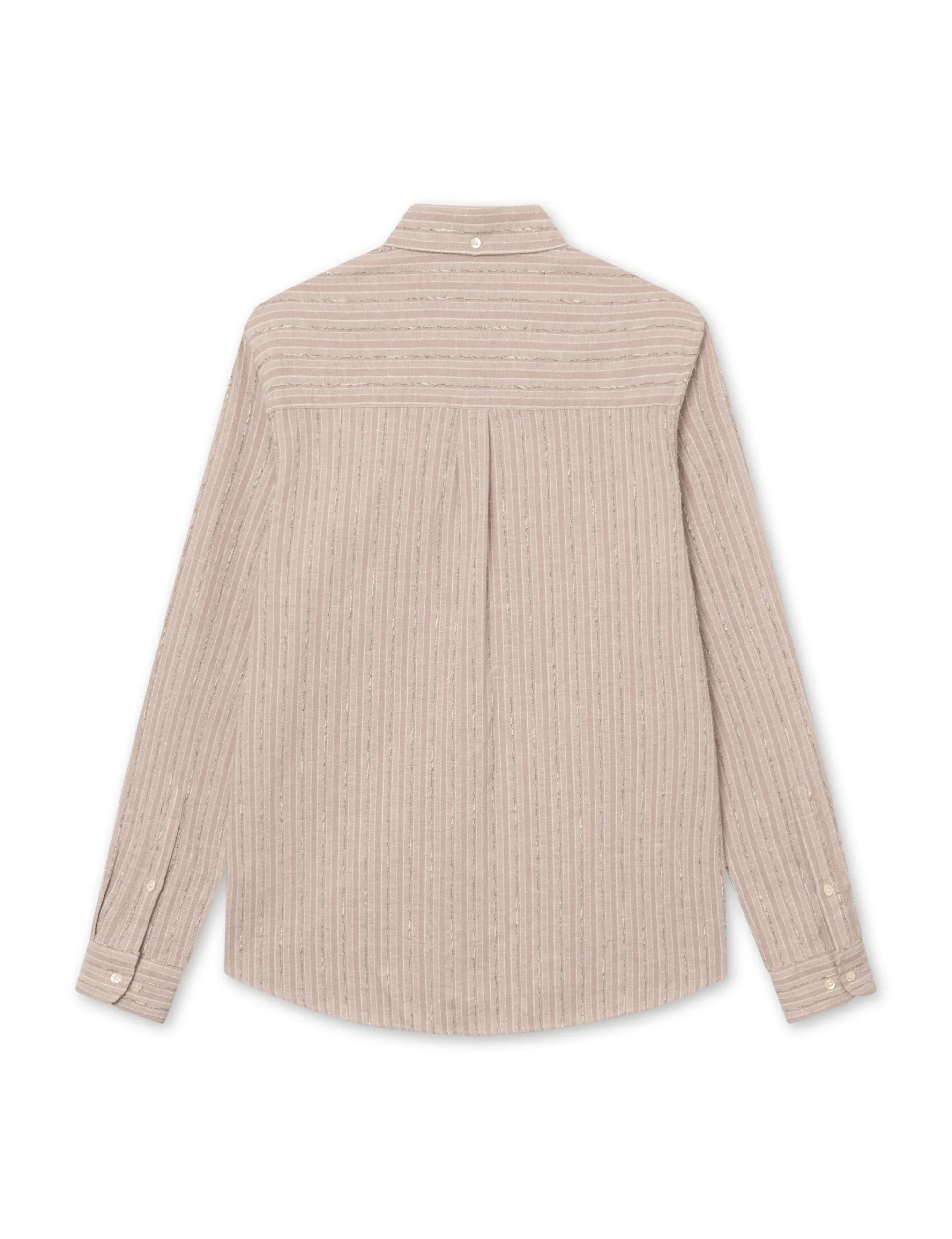 Crafted from a structured fabric with a palpable texture, this shirt embodies the perfect blend of form and function. With its neutral khaki stripes, it exudes understated elegance for the modern explorer.