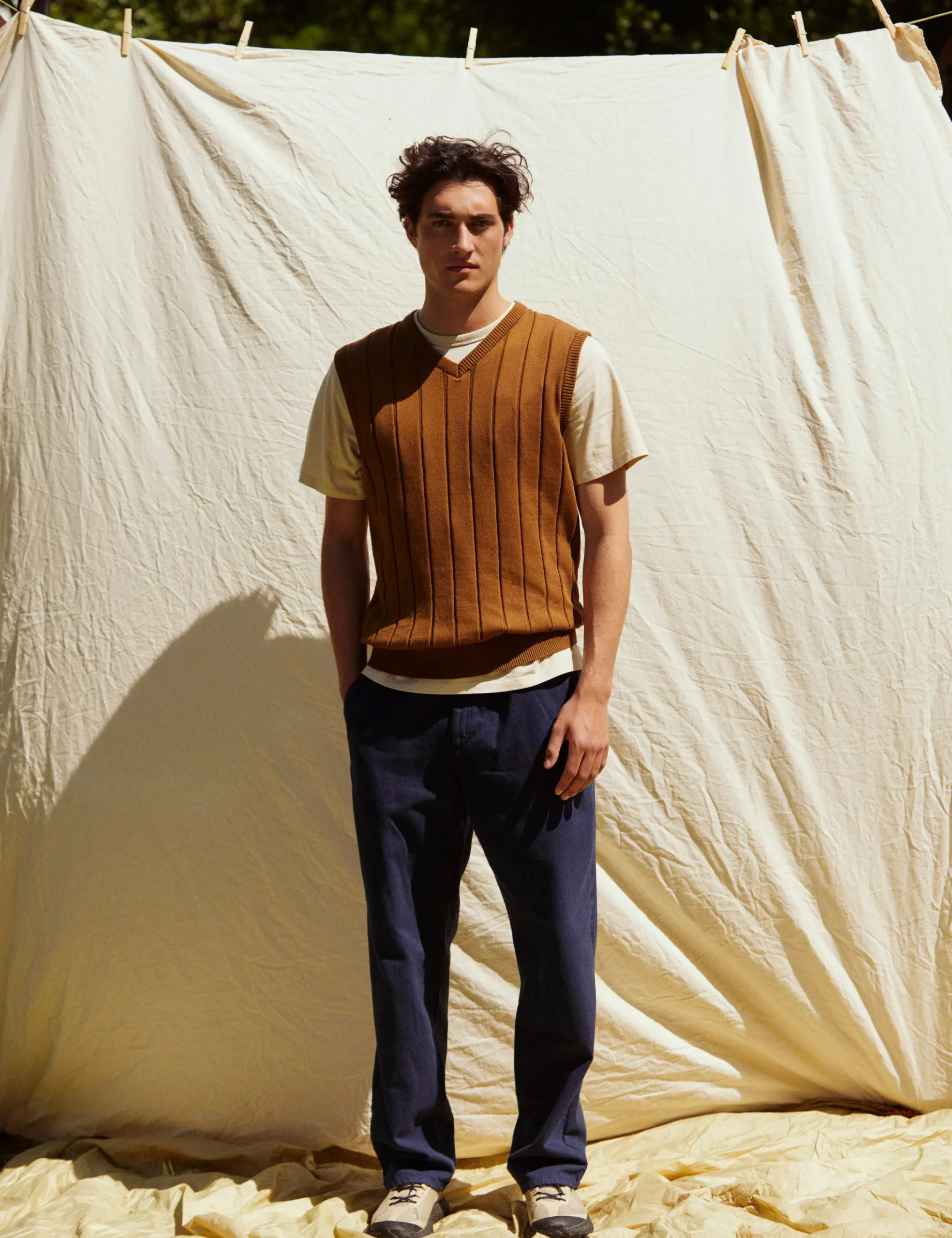 Step into laid-back elegance with our earth-toned striped knit vest. This summer-perfect piece seamlessly blends comfort and style, bringing a timeless and relaxed vibe to your wardrobe.